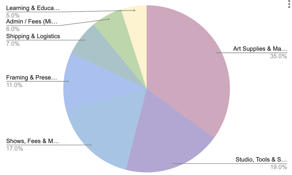 The largest portion of my expenses went to art supplies. That includes paper, paint, framing, and presentation materials. The second largest category was studio tools and visibility costs, including show fees and platform expenses.