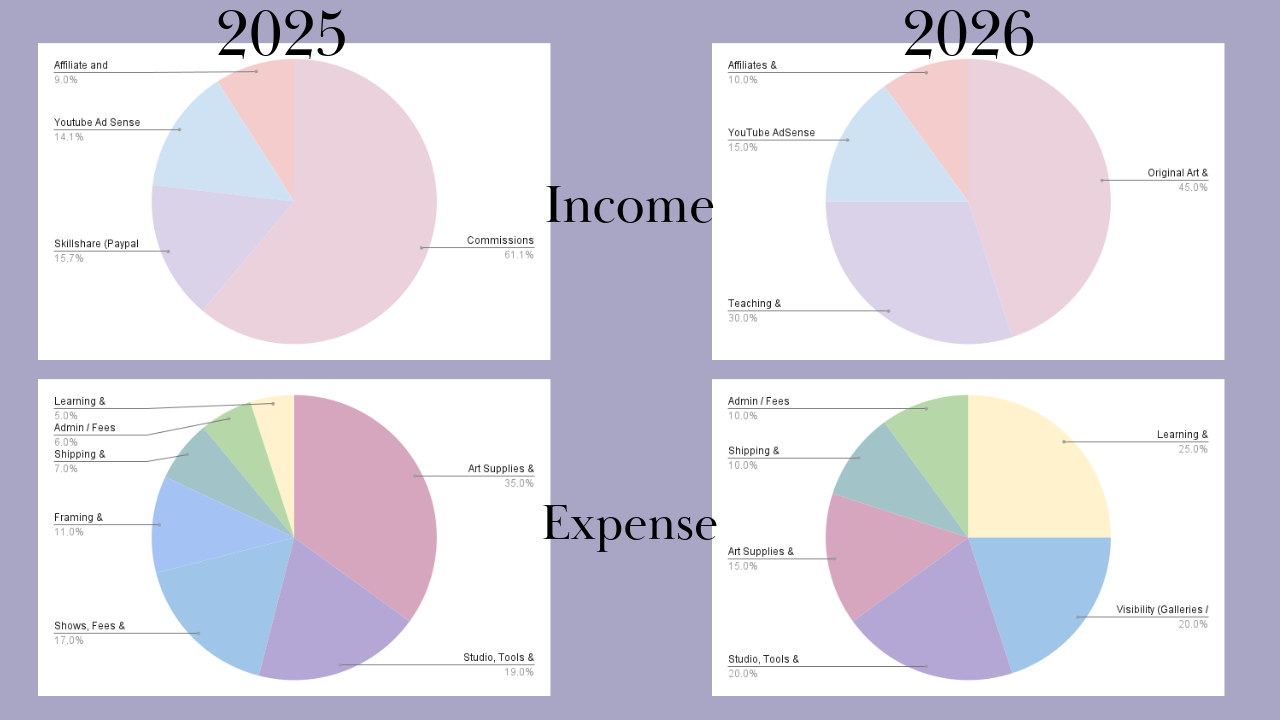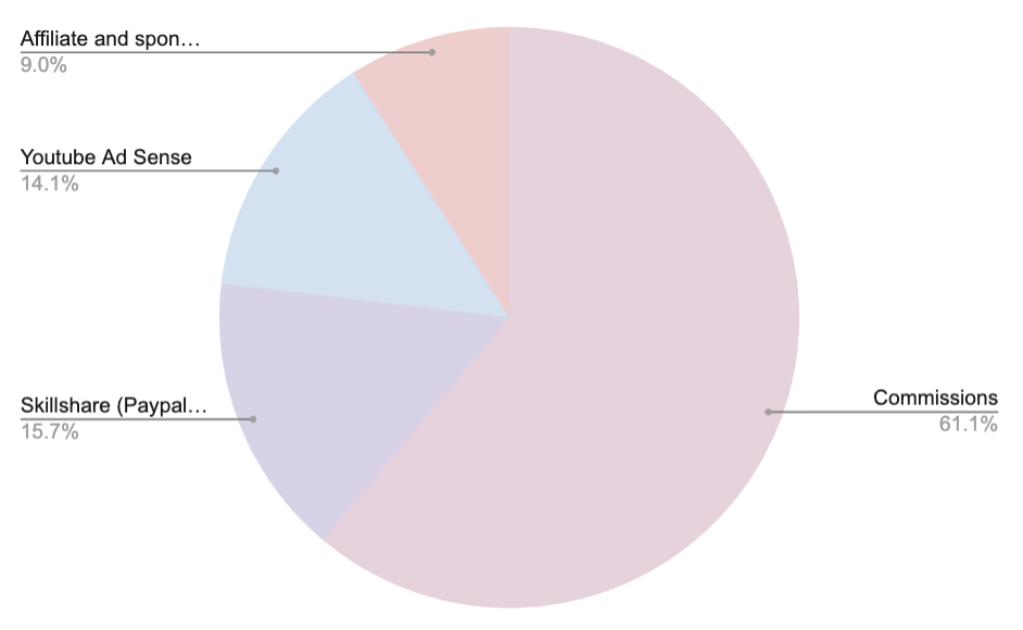 In 2025, most of my income came from commissions. Smaller portions came from teaching platforms, YouTube, and affiliate links.